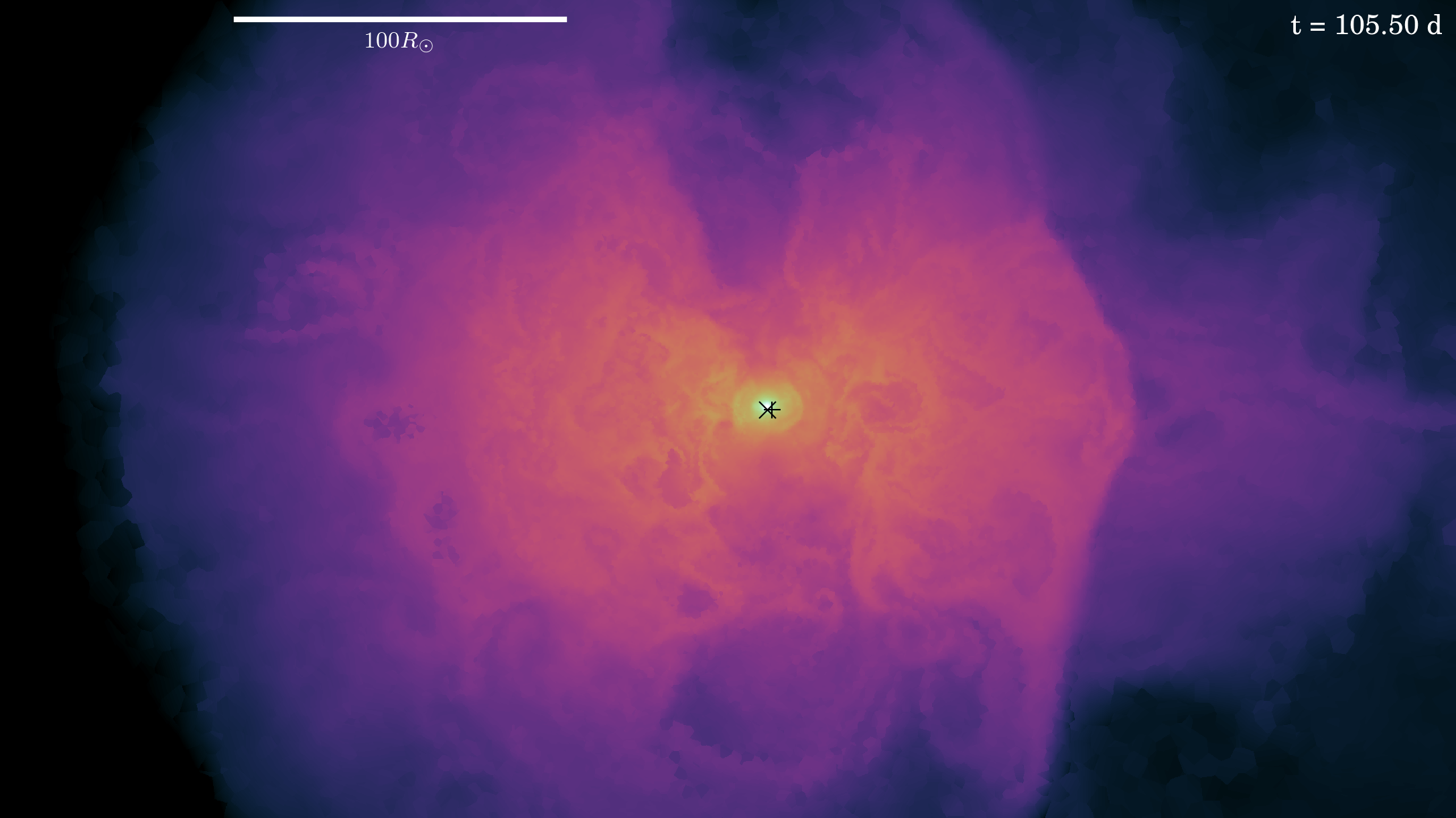 Anhang: Schnitt durch das dreidimensionale Simulationsvolumen nach 105 Tagen in der gemeinsamen Hülle. Bild 2 zeigt einen Schnitt senkrecht dazu. Der Maßstab beträgt 100 Sonnenradien.