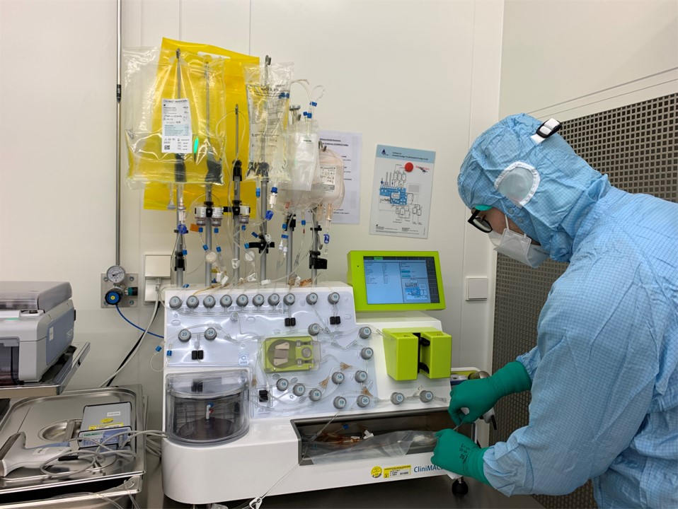 Im Reinraum werden Immunzellen der Patienten:innen mit speziellen Apparaturen aus dem Blut gefiltert und gentechnisch so verändert, dass sie die Krebszellen erkennen und bekämpfen.