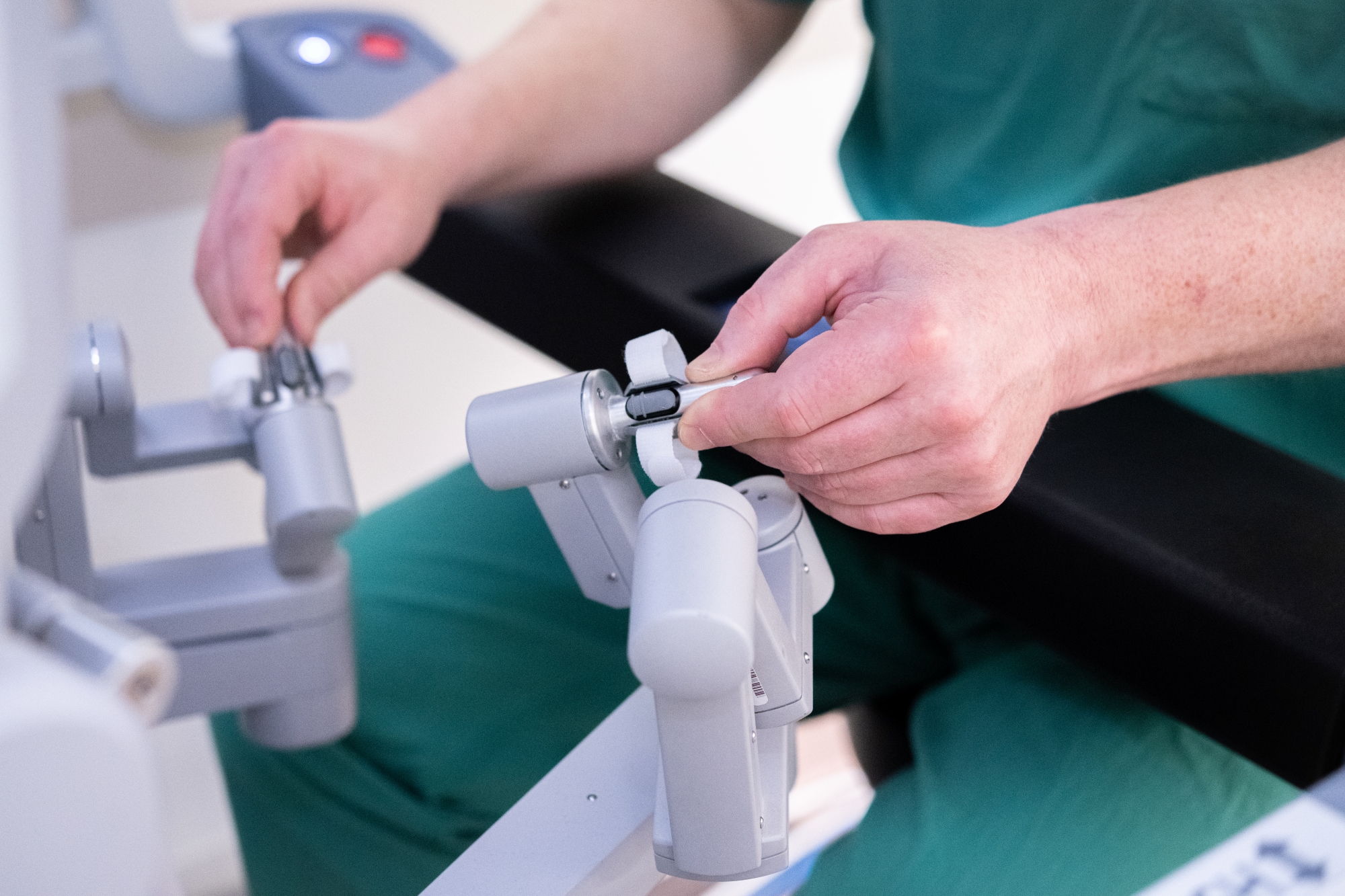 Attachment: Bild 3: Die Instrumente des Roboters steuert die Chirurgin bzw. der Chirurg im Cockpit exakt und hochpräzise mit den Bedienelementen und Pedalen