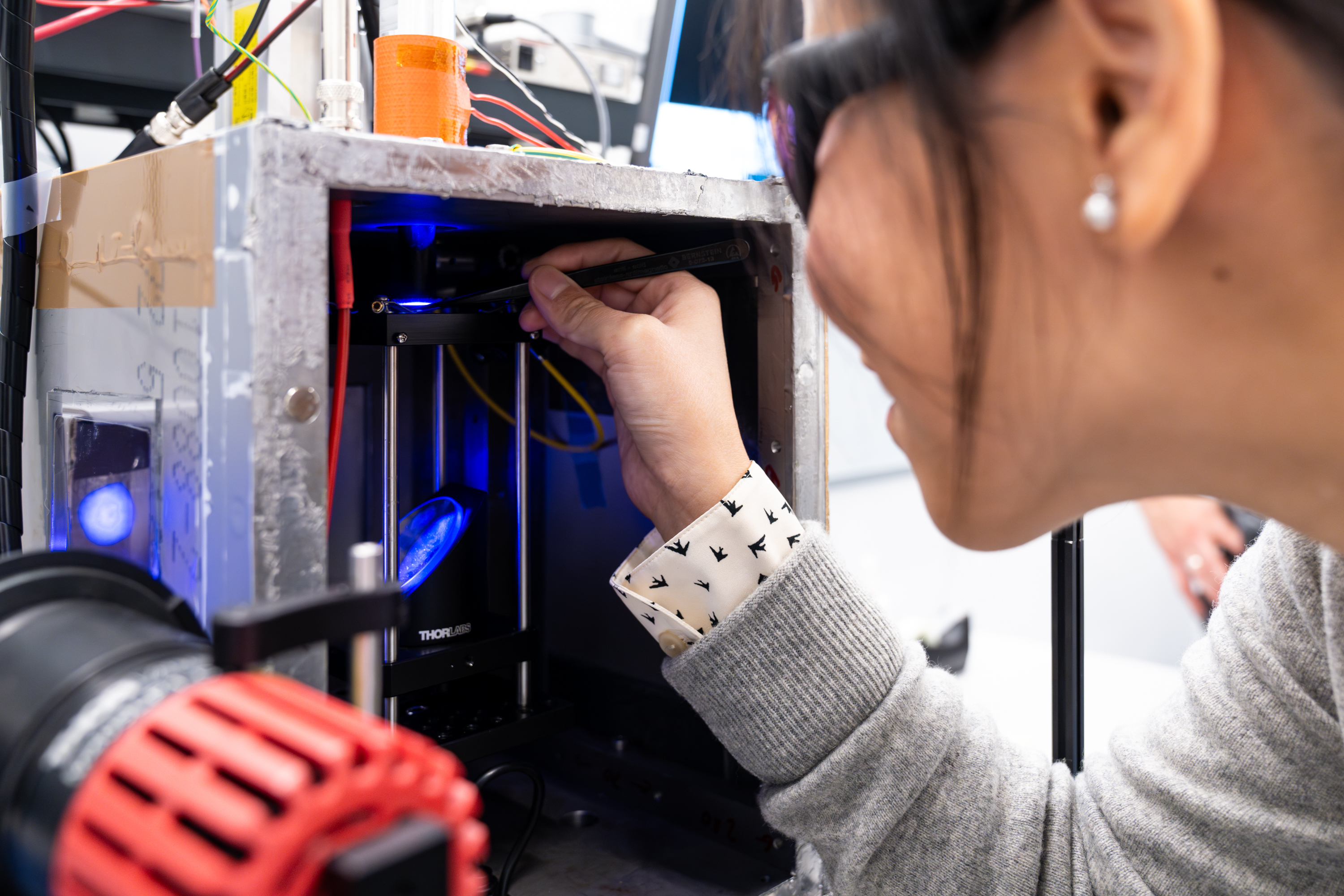 Attachment: Die ISTA Erstautorin der Studie, Sue Shi, platziert einen Partikel in die akustische Levitationsvorrichtung.