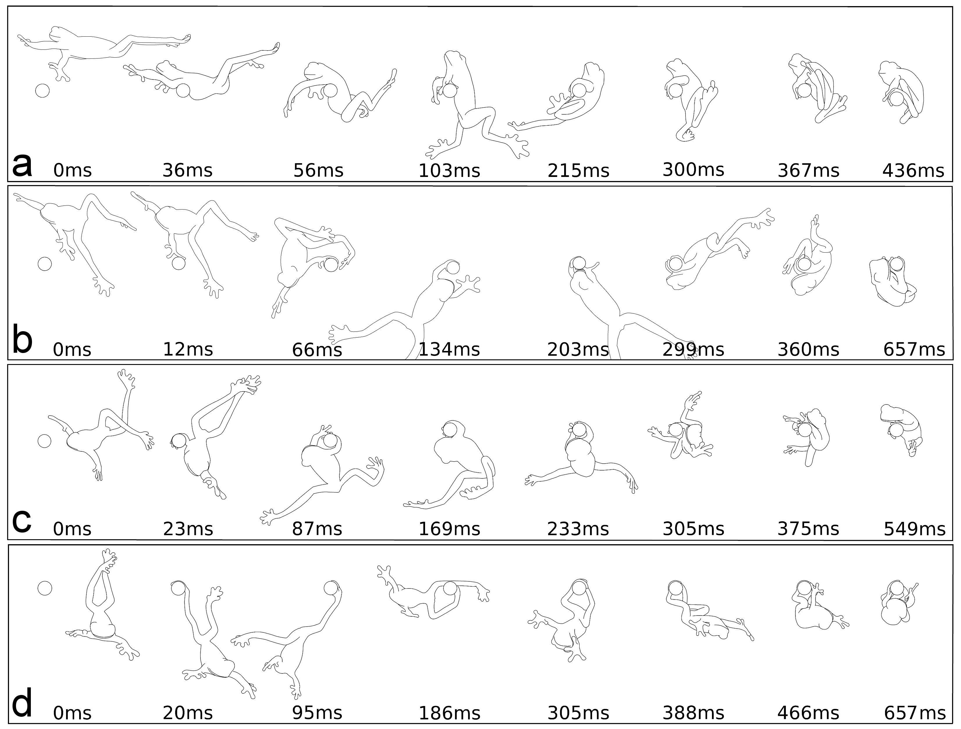 Attachment: Drawing of the various landing techniques: (A) landing on the stomach; (B) front leg sticks, swing over a twig; (C) front leg sticks, swing under a twig; (D) back leg sticks