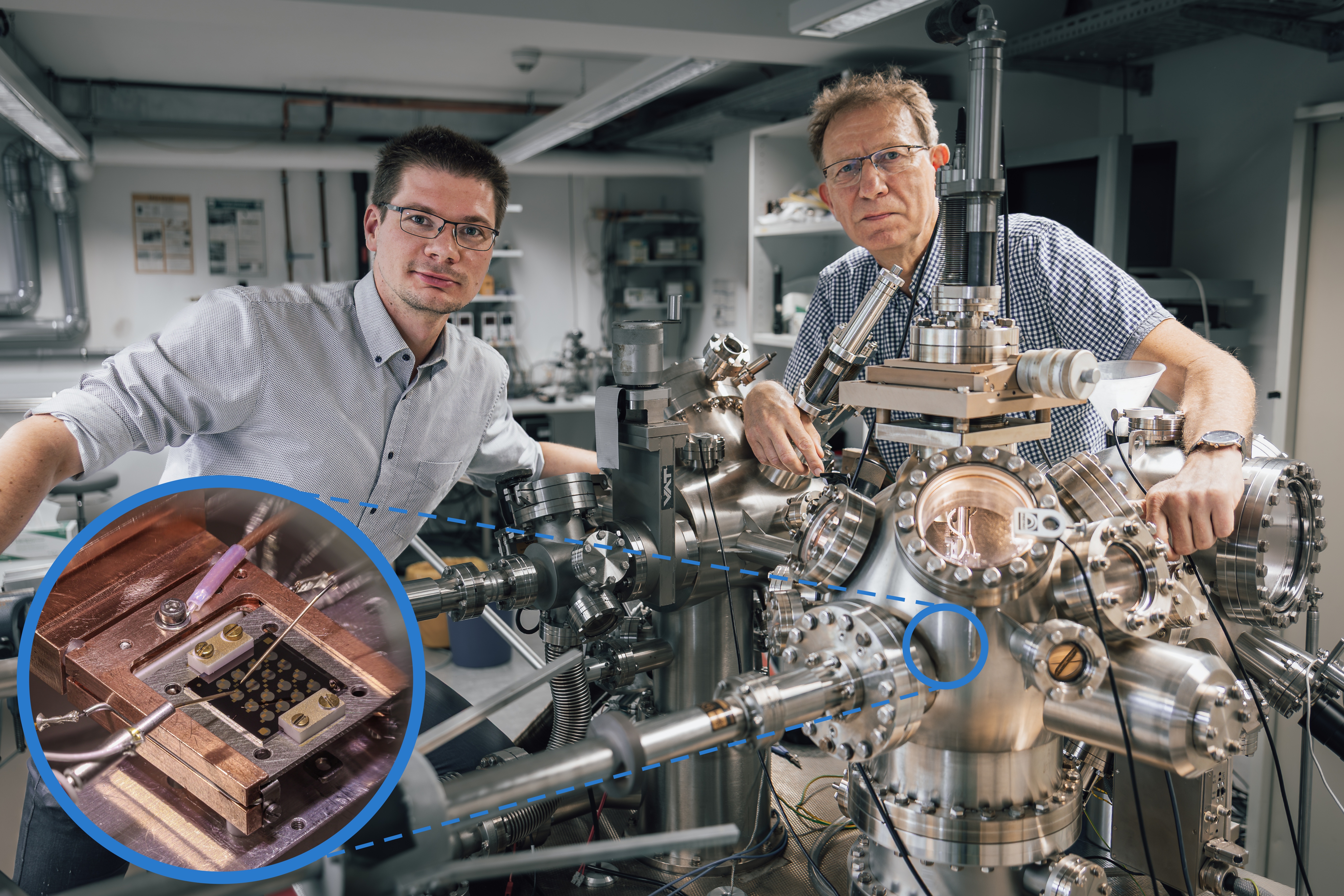Bildtext: Yurii Radiev und Gregor Witte untersuchen mit verschiedenen physikalischen Messgeräten den inneren Aufbau organischer Elektronik; der Einschub zeigt einen Chip mit kontaktierten organischen Transistoren, der sich im Inneren der Apparatur befindet. Foto: Peter Oßwald.