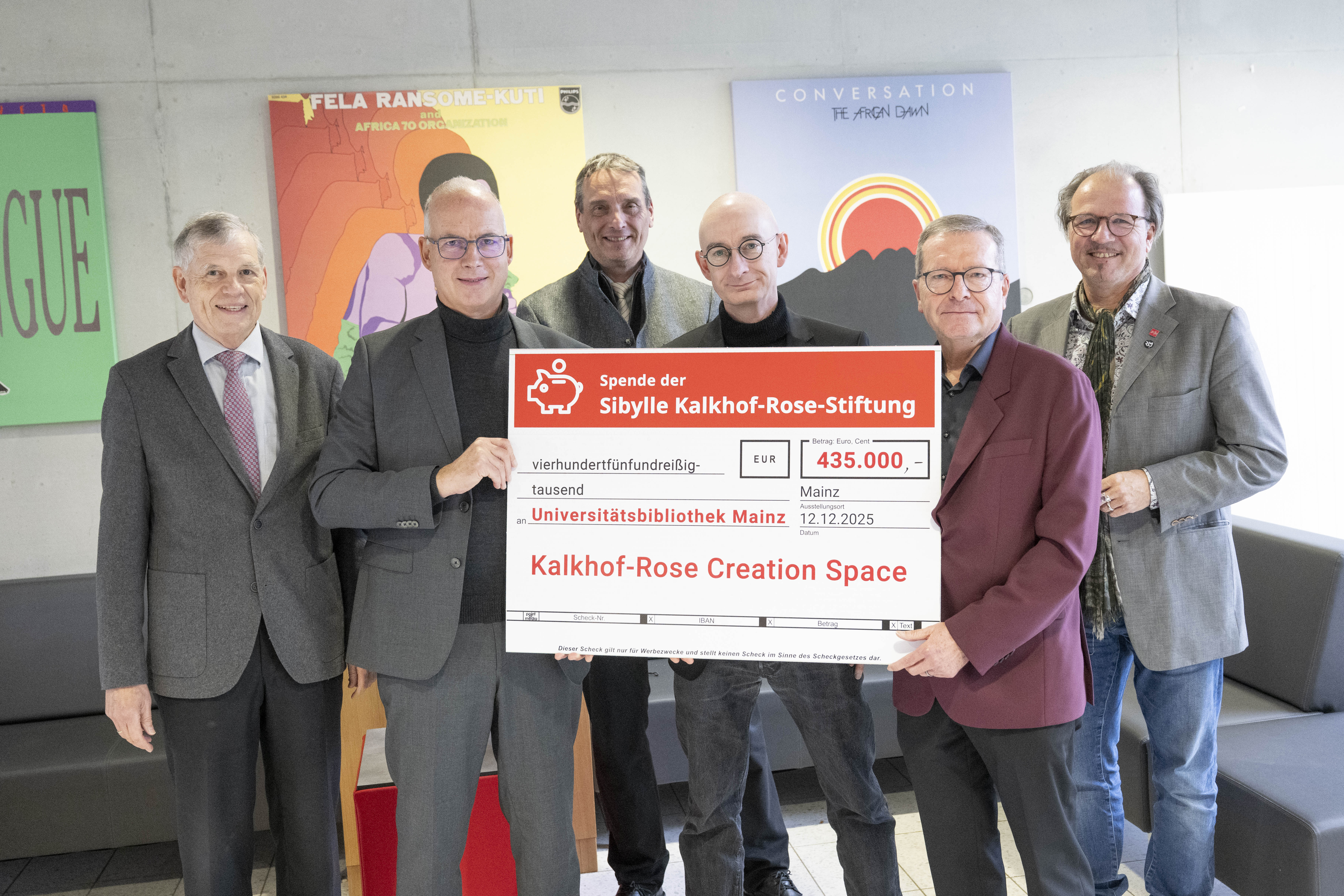 Symbolische Scheckübergabe zur Einrichtung des Kalkhof-Rose Creation Space: (v.l.) Dr. Ullrich Fechner (Vorsitzender der JGU-Stiftung), JGU-Präsident Prof. Dr. Georg Krausch, JGU-Vizepräsident Prof. Dr. Stefan Müller-Stach, Dr. Michael Hansen (Direktor der Universitätsbibliothek Mainz), Dr. Wolfgang Litzenburger (Vorsitzender des Kuratoriums der Sibylle Kalkhof-Rose-Stiftung) und JGU-Vizepräsident Prof. Dr. Stephan Jolie