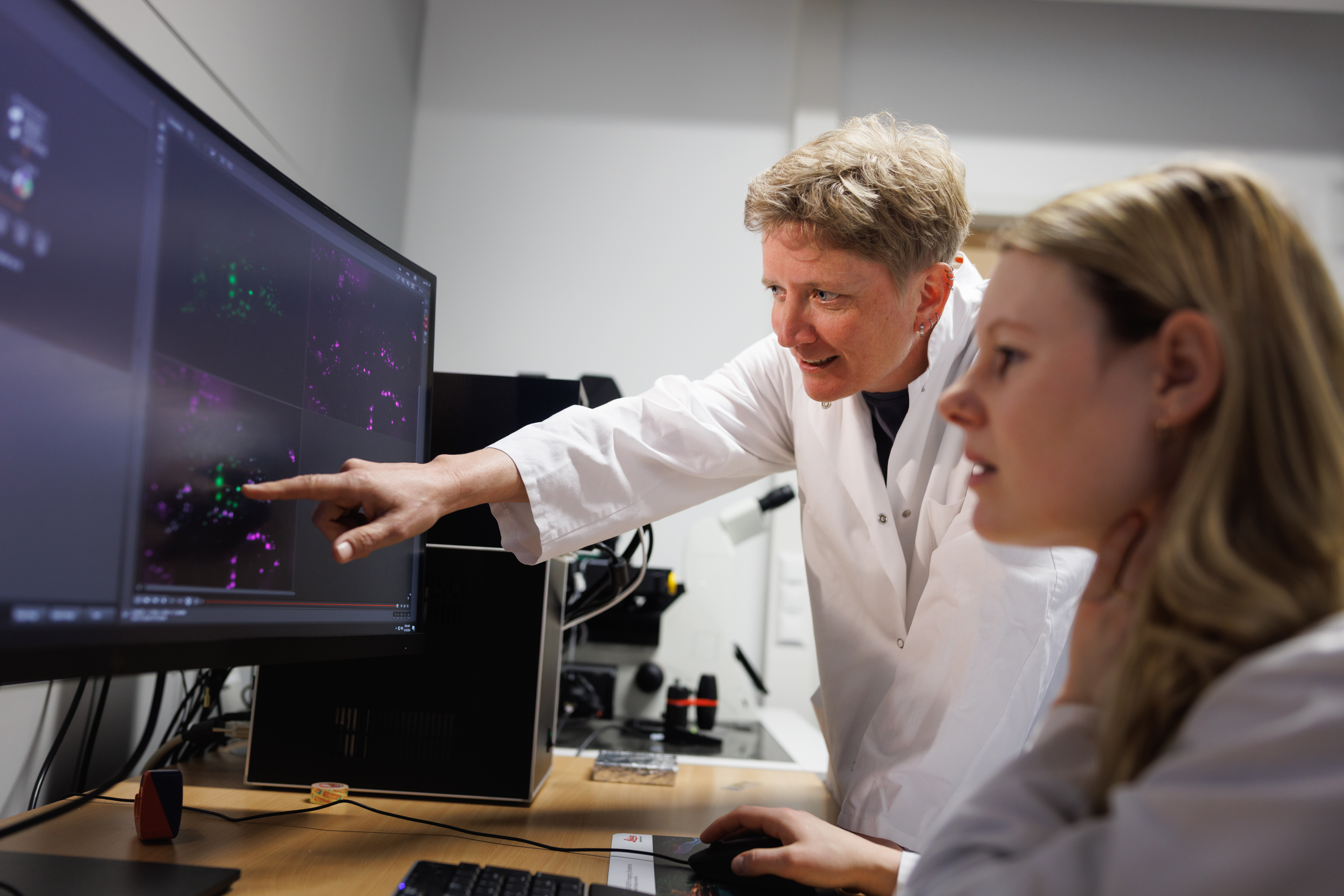 Bildtext 1: Prof. Dr. Eva Herker und Doktorandin Laura Schneider sind an Mikroskopaufnahmen den Fetttröpfchen auf der Spur. Foto: Jan Bosch